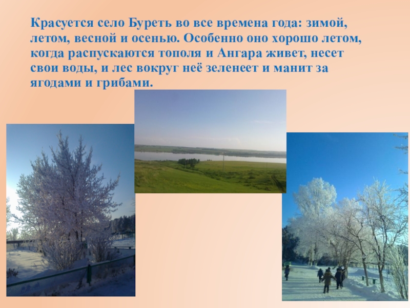 Слайд 6Красуется село Буреть во все времена года: зимой, летом, весной и