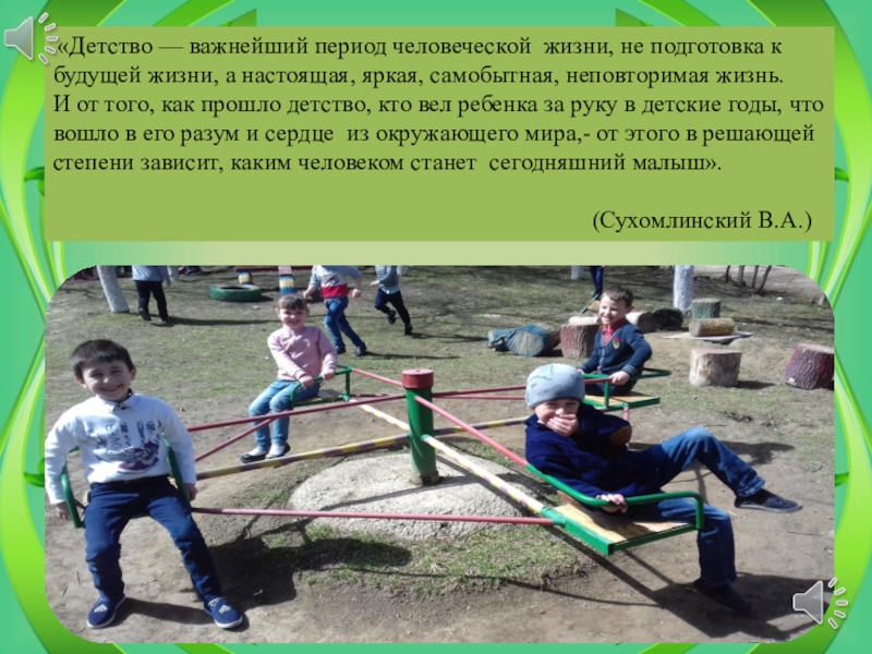 Слайд 2 «Детство — важнейший период человеческой жизни, не подготовка к будущей жизни,