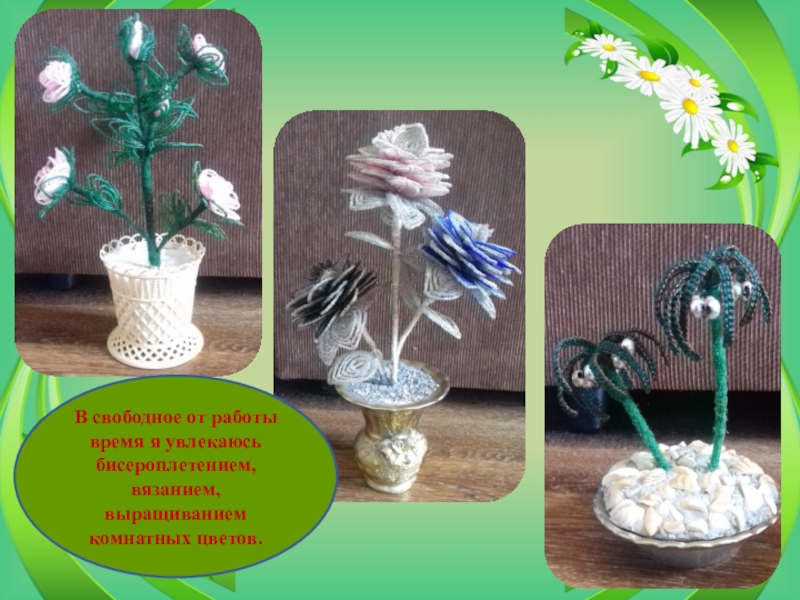 Слайд 25В свободное от работы время я увлекаюсь бисероплетением, вязанием, выращиванием комнатных