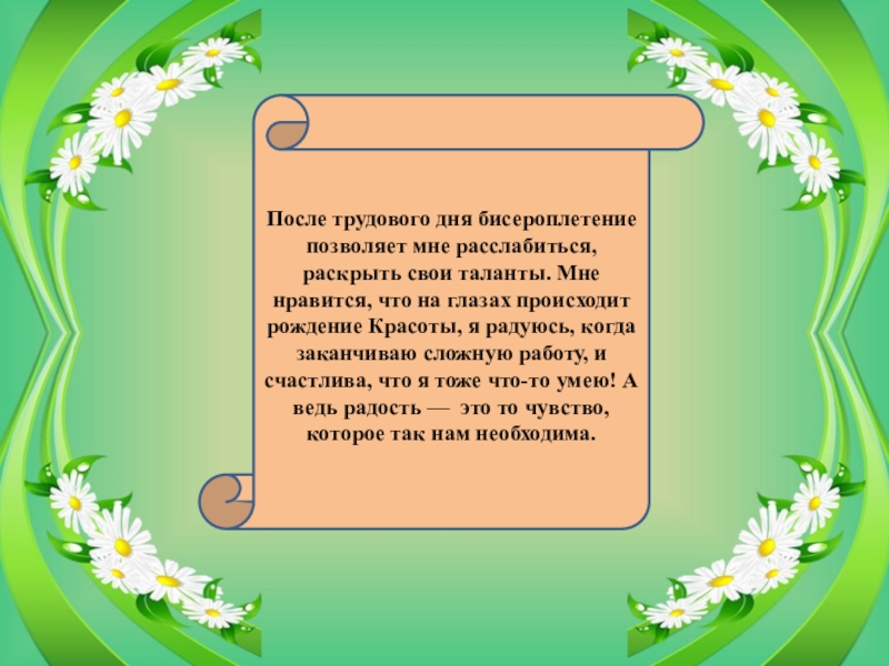 Слайд 27После трудового дня бисероплетение позволяет мне расслабиться, раскрыть свои таланты. Мне
