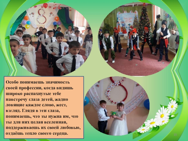 глаза детей, жадно ловящие каждое слово, жест, взгляд. Глядя в эти глаза, понимаешь, что ты нужна им, что ты для них целая вселенная, поддерживаешь их своей любовью, отдаёшь тепло своего сердца.