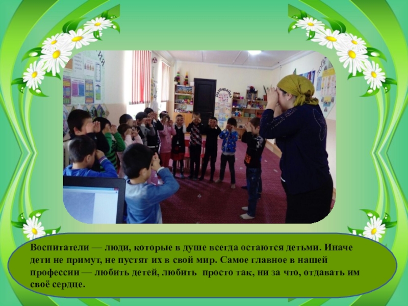 Слайд 13Воспитатели — люди, которые в душе всегда остаются детьми. Иначе дети