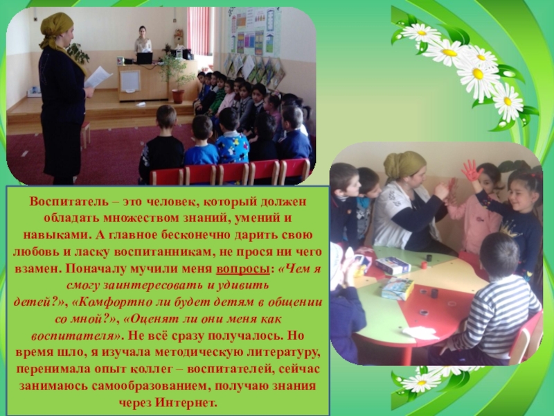 навыками. А главное бесконечно дарить свою любовь и ласку воспитанникам, не прося ни чего взамен. Поначалу мучили меня вопросы: «Чем я смогу заинтересовать и удивить детей?», «Комфортно ли будет детям в общении со мной?», «Оценят ли они меня как воспитателя». Не всё сразу получалось. Но время шло, я изучала методическую литературу, перенимала опыт коллег – воспитателей, сейчас занимаюсь самообразованием, получаю знания через Интернет.