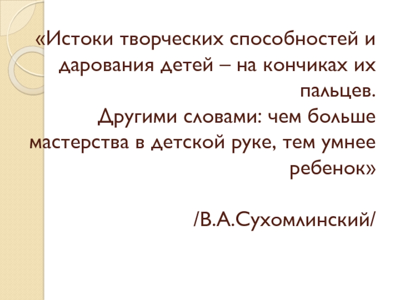Слайд 2«Истоки творческих способностей и дарования детей – на кончиках их пальцев.