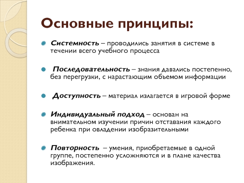 Основные принципы:Системность – проводились занятия в системе в течении всего учебного процесса Последовательность – знания давались постепенно, без