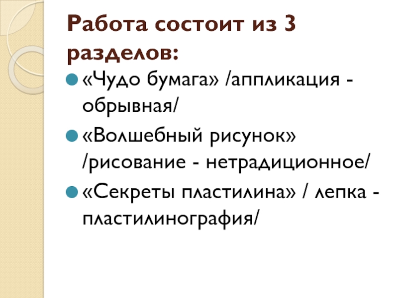 Работа состоит из 3 разделов:«Чудо бумага» /аппликация - обрывная/«Волшебный рисунок» /рисование - нетрадиционное/«Секреты пластилина» / лепка -