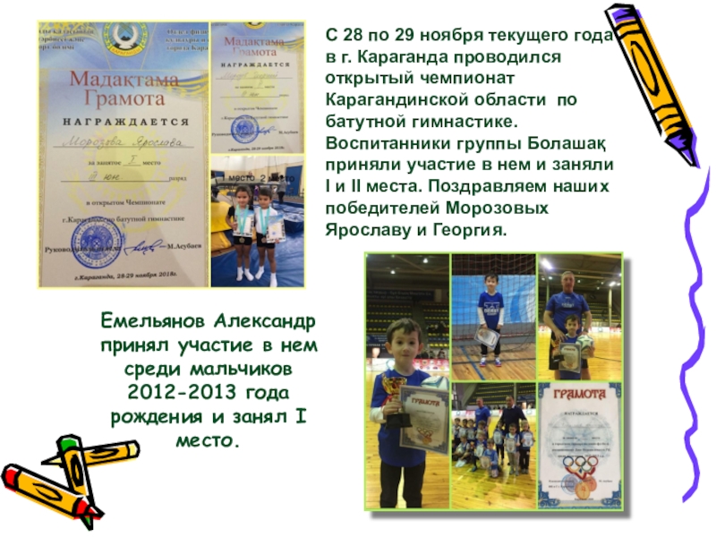 С 28 по 29 ноября текущего года в г. Караганда проводился открытый чемпионат Карагандинской области по батутной гимнастике. Воспитанники группы Болашақ приняли участие в нем и заняли I и II места. Поздравляем наших победителей Морозовых Ярославу и Георгия.