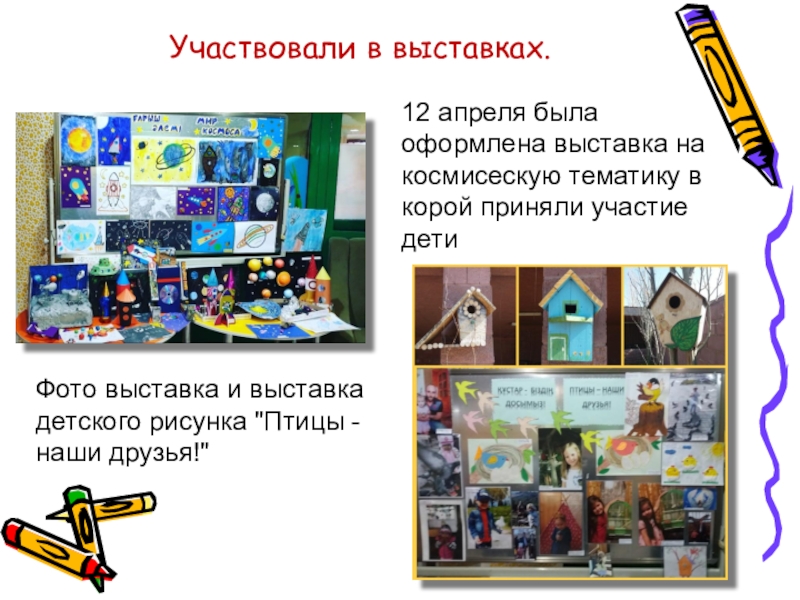 12 апреля была оформлена выставка на космисескую тематику в корой приняли участие дети