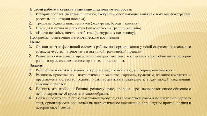 экскурсии, обобщающие занятия с показом фотографий, рассказы по истории поселка).