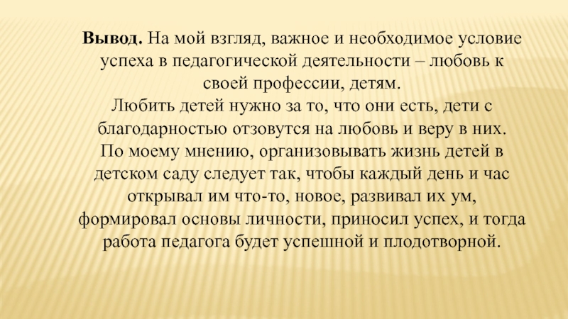 Слайд 11Вывод. На мой взгляд, важное и необходимое условие успеха в педагогической деятельности