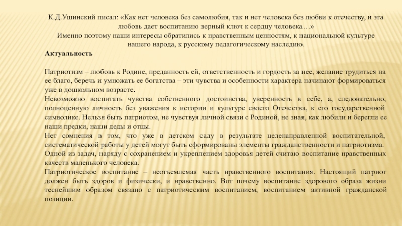 без любви к отечеству, и эта любовь дает воспитанию верный ключ к сердцу человека…»