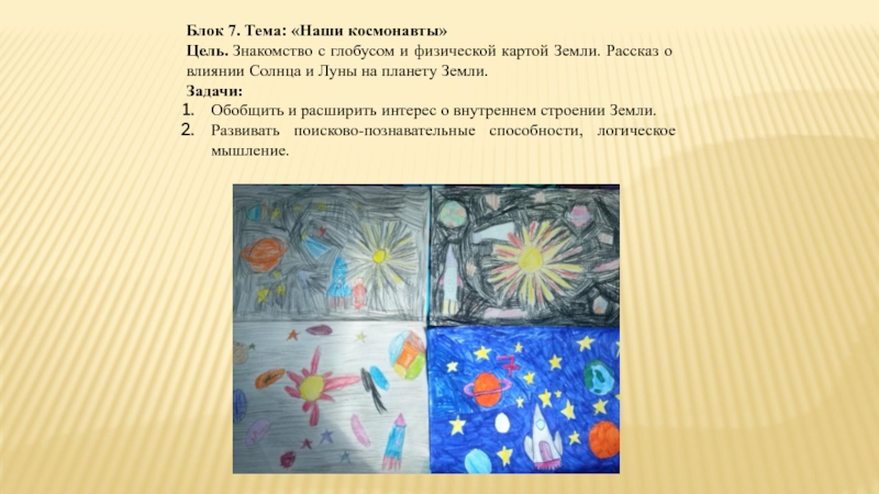 Слайд 9Блок 7. Тема: «Наши космонавты»