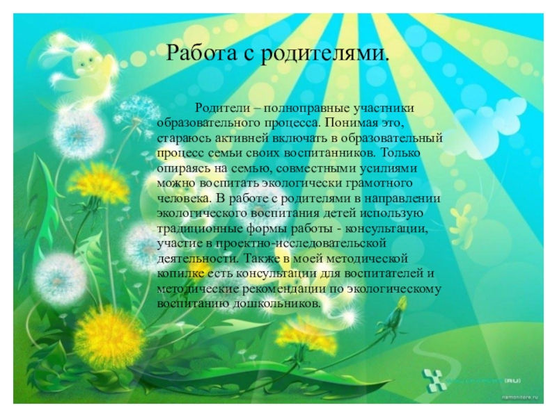 Экологическое просвещение родителей, пропаганда экологических знаний, организация акций.