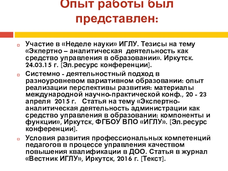 Системно - деятельностный подход в разноуровневом вариативном образовании: опыт реализации перспективы развития: материалы международной научно-практической конф., 20 - 23 апреля 2015 г. Статья на тему «Экспертно-аналитическая деятельность администрации как средство управления в образовании: компоненты и функции», Иркутск, ФГБОУ ВПО «ИГЛУ». [Эл.ресурс конференции].