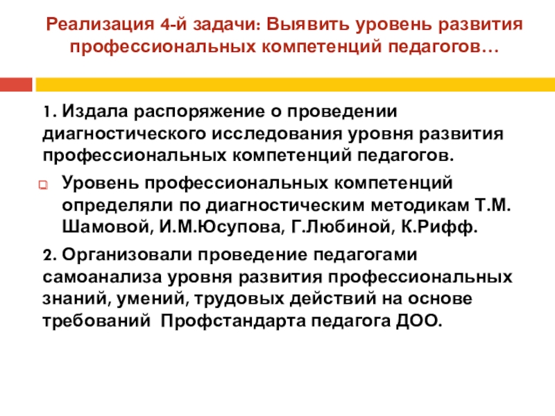 Слайд 18Реализация 4-й задачи: Выявить уровень развития профессиональных компетенций педагогов…
