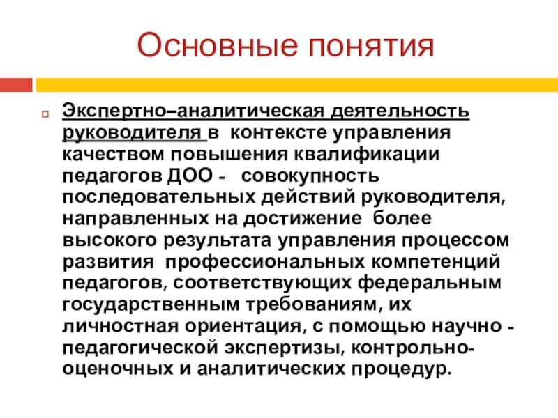 ДОО - совокупность последовательных действий руководителя, направленных на достижение более высокого результата управления процессом развития профессиональных компетенций педагогов, соответствующих федеральным государственным требованиям, их личностная ориентация, с помощью научно - педагогической экспертизы, контрольно-оценочных и аналитических процедур.