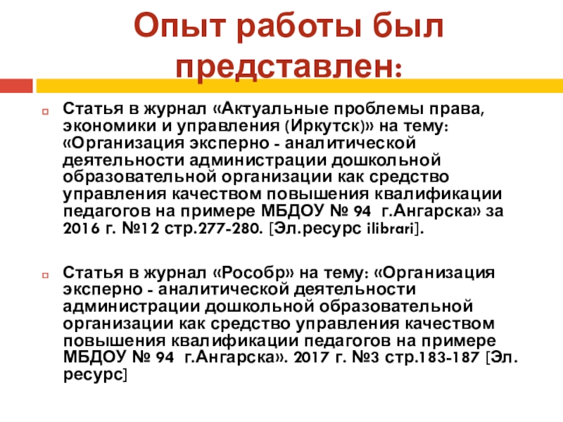 управления (Иркутск)» на тему: «Организация эксперно - аналитической деятельности администрации дошкольной образовательной организации как средство управления качеством повышения квалификации педагогов на примере МБДОУ № 94 г.Ангарска» за 2016 г. №12 стр.277-280. [Эл.ресурс ilibrari].