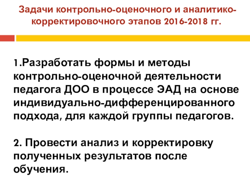 Слайд 19Задачи контрольно-оценочного и аналитико-корректировочного этапов 2016-2018 гг.