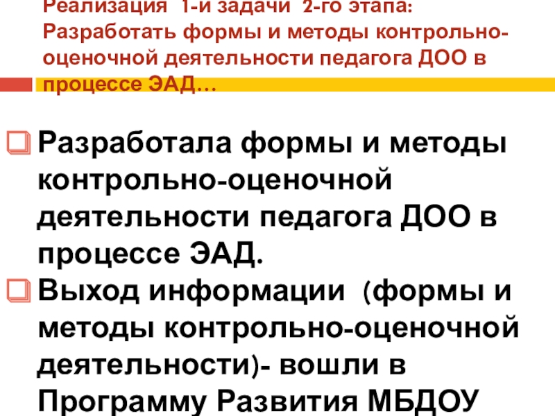 Слайд 20Реализация 1-й задачи 2-го этапа: Разработать формы и методы контрольно-оценочной деятельности