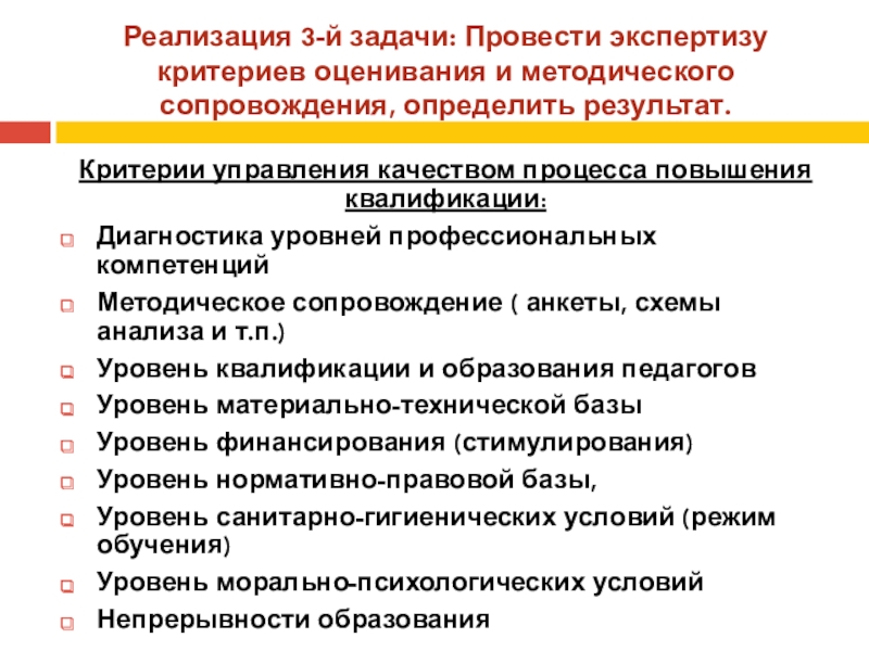 Слайд 13Реализация 3-й задачи: Провести экспертизу критериев оценивания и методического сопровождения, определить