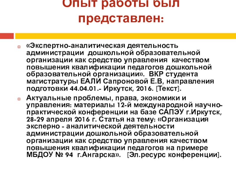 Актуальные проблемы, права, экономики и управления: материалы 12-й международной научно- практической конференции на базе САПЭУ г.Иркутск, 28-29 апреля 2016 г. Статья на тему: «Организация эксперно - аналитической деятельности администрации дошкольной образовательной организации как средство управления качеством повышения квалификации педагогов на примере МБДОУ № 94 г.Ангарска». [Эл.ресурс конференции].