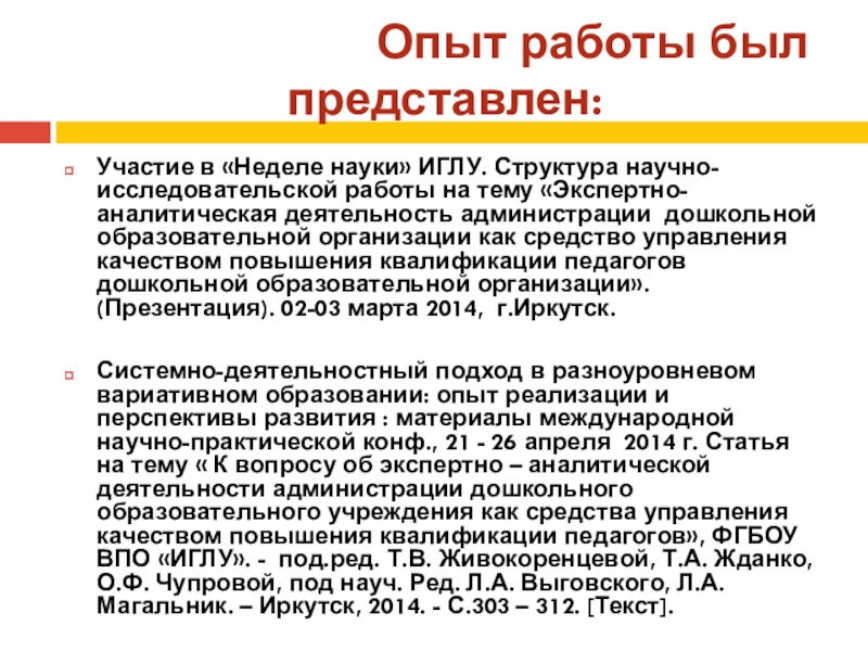 науки» ИГЛУ. Структура научно-исследовательской работы на тему «Экспертно-аналитическая деятельность администрации дошкольной образовательной организации как средство управления качеством повышения квалификации педагогов дошкольной образовательной организации». (Презентация). 02-03 марта 2014, г.Иркутск.