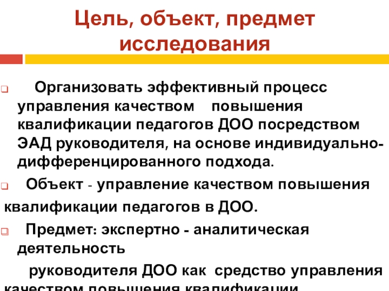 повышения квалификации педагогов ДОО посредством ЭАД руководителя, на основе индивидуально-дифференцированного подхода.