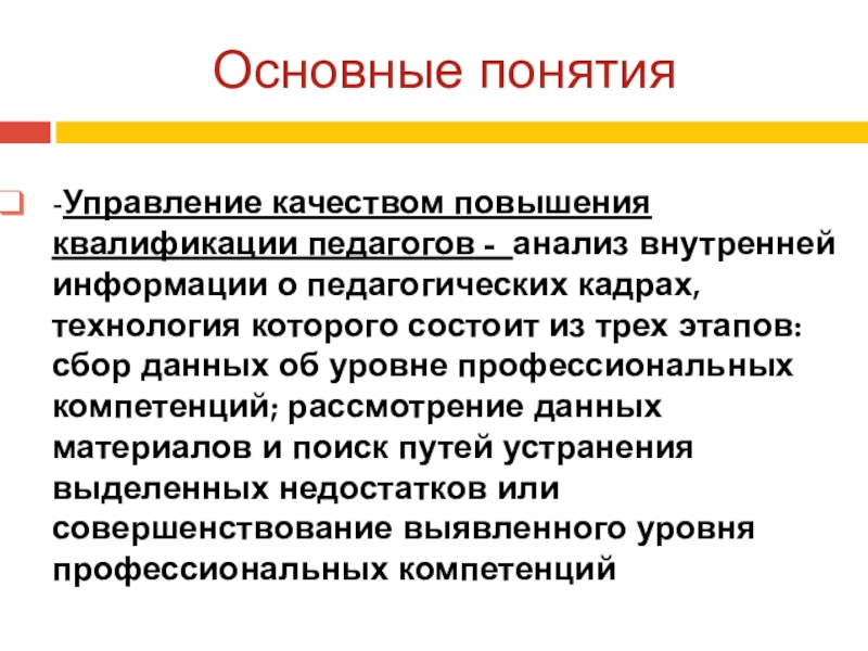 педагогических кадрах, технология которого состоит из трех этапов: сбор данных об уровне профессиональных компетенций; рассмотрение данных материалов и поиск путей устранения выделенных недостатков или совершенствование выявленного уровня профессиональных компетенций