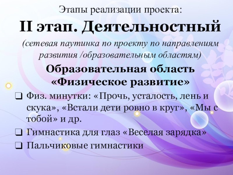 Физ. минутки: «Прочь, усталость, лень и скука», «Встали дети ровно в круг», «Мы с тобой» и др.