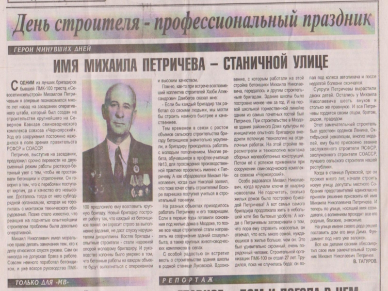 Творческий проект. «Их имена названы улицы  станицы».Тихонов М.НПетричев М.Н