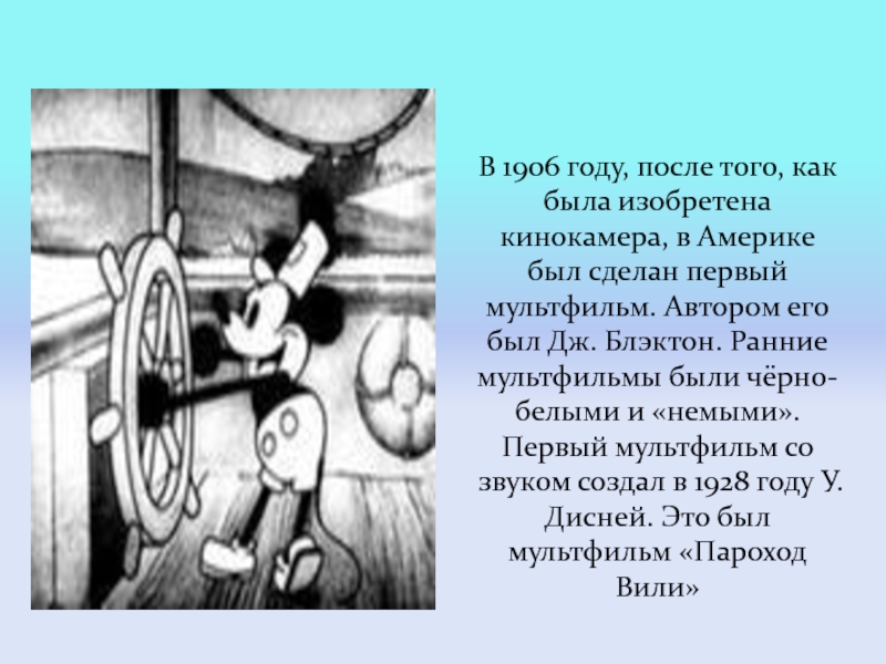 был сделан первый мультфильм. Автором его был Дж. Блэктон. Ранние мультфильмы были чёрно-белыми и «немыми». Первый мультфильм со звуком создал в 1928 году У. Дисней. Это был мультфильм «Пароход Вили»