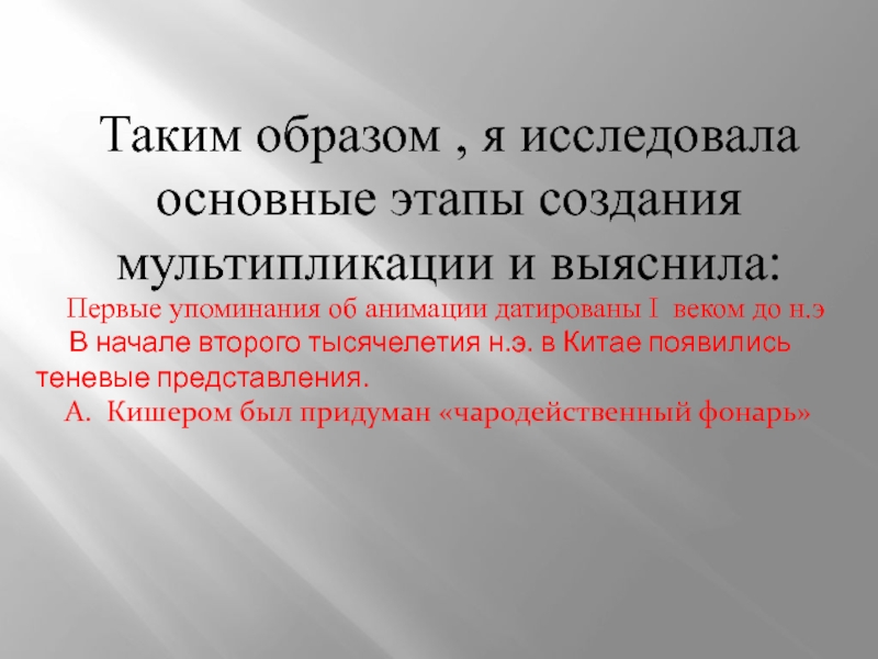 Таким образом , я исследовала основные этапы создания мультипликации и выяснила:Первые упоминания об анимации датированы I  веком