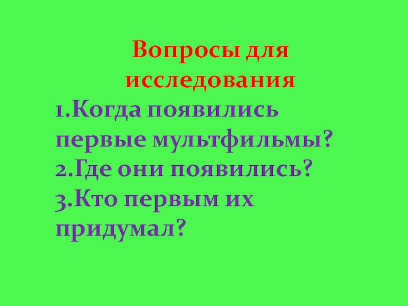 Вопросы для исследования1.Когда появились первые мультфильмы?2.Где они появились?3.Кто первым их придумал?