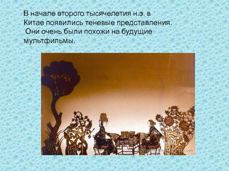 В начале второго тысячелетия н.э. в Китае появились теневые представления. Они очень были похожи на будущие мультфильмы.