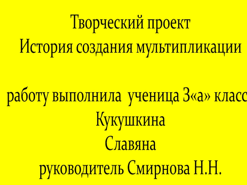Слайд 1Творческий проект История создания мультипликации работу выполнила ученица З«а» класса Кукушкина Славяна руководитель Смирнова Н.Н.