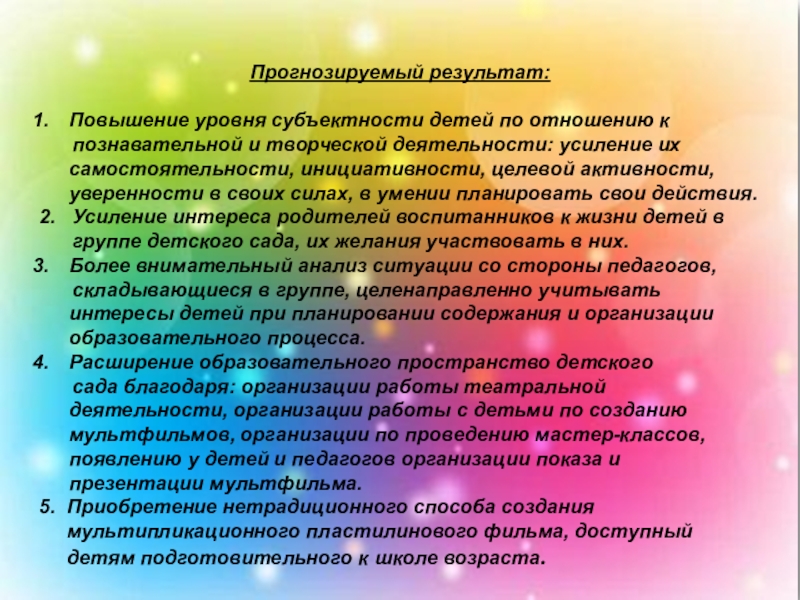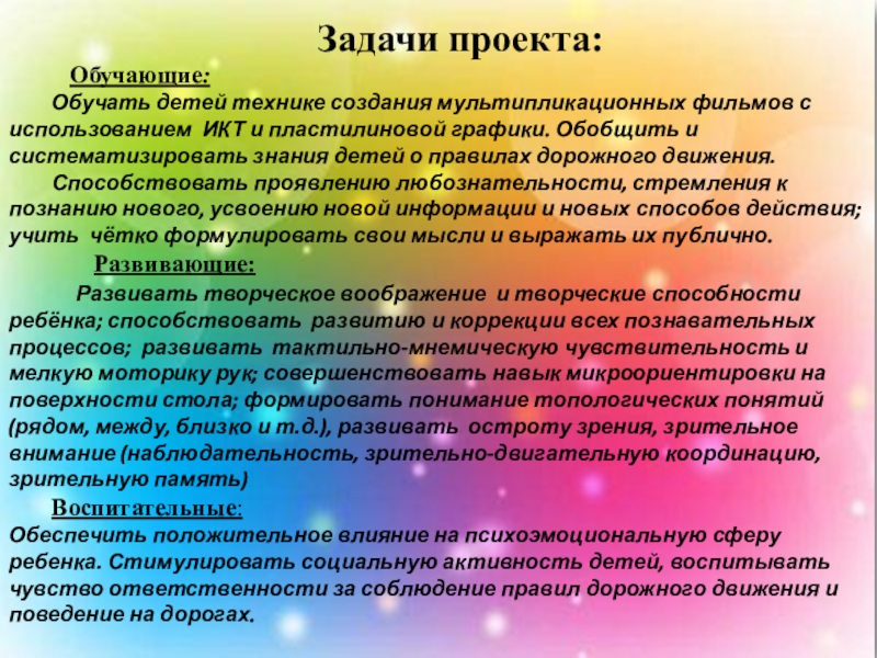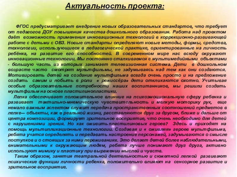 требует от педагогов ДОУ повышения качества дошкольного образования. Работа над проектом даёт возможность применения инновационных технологий в коррекционно-развивающей работе с детьми с ОВЗ. Новые стандарты определяют новые методы, формы, средства, технологии, использующиеся в педагогической практике, ориентированные на личность ребёнка, на развитие его способностей. В современном мире нас всюду окружают инновационные технологии. Мы постоянно сталкиваемся с мультимедийными объектами - большую часть из которых занимает телевизионная система. Дети в дошкольном возрасте часто смотрят мультфильмы, не задумываясь над тем как они создаются. Мотивировать детей на создание мультфильма всегда очень просто и на предложение создать самим и побыть в роли « режиссёра» дети откликаются охотно. Учитывая особые образовательные потребности наших воспитанников, мы решили создать мультфильм на основе пластилинопластики.