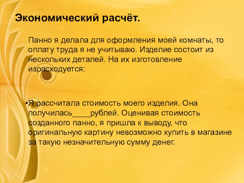 Я рассчитала стоимость моего изделия. Она получилась____рублей. Оценивая стоимость созданного панно, я пришла к выводу, что оригинальную картину невозможно купить в магазине за такую незначительную сумму денег.
