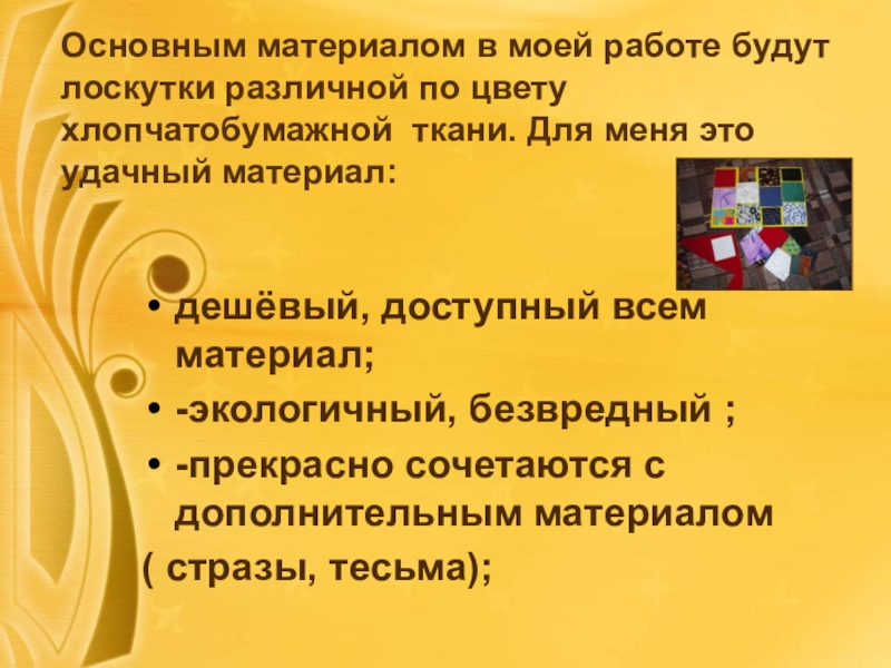 Слайд 12Основным материалом в моей работе будут лоскутки различной по цвету хлопчатобумажной