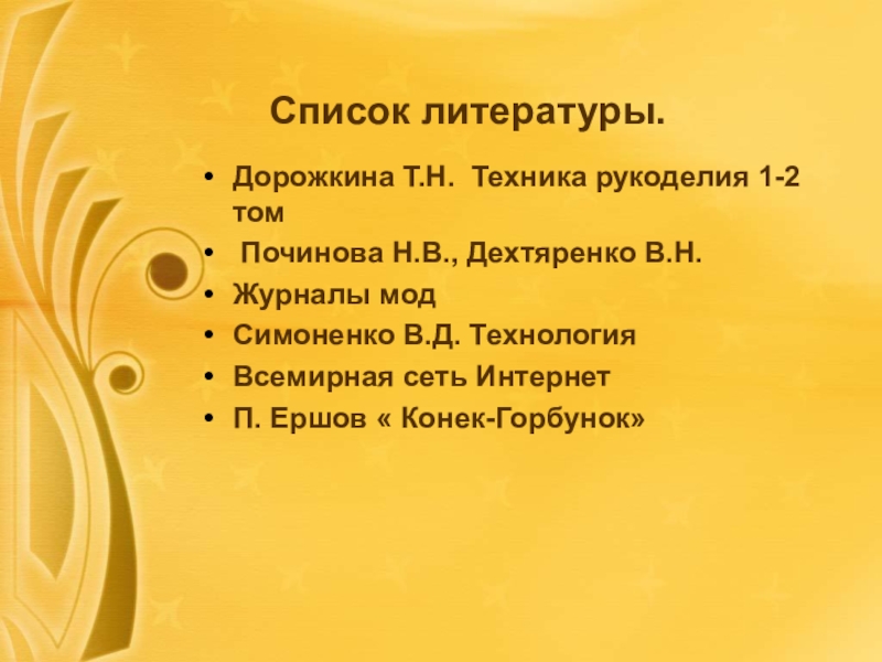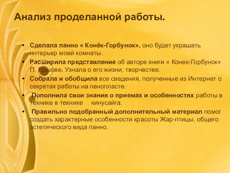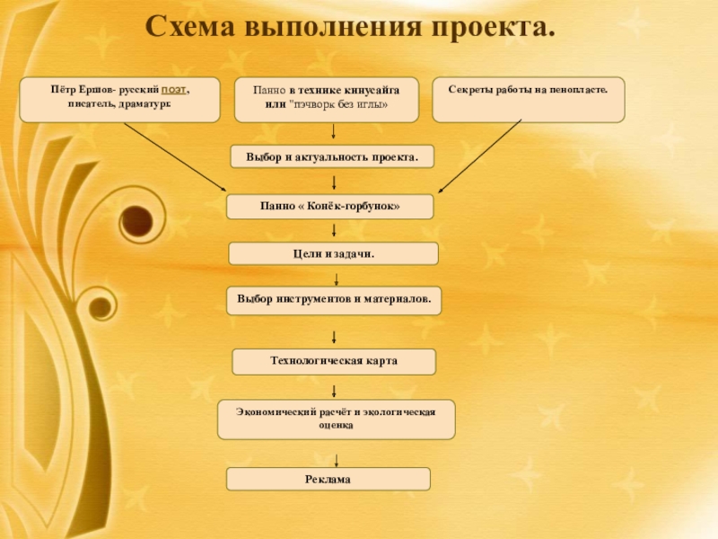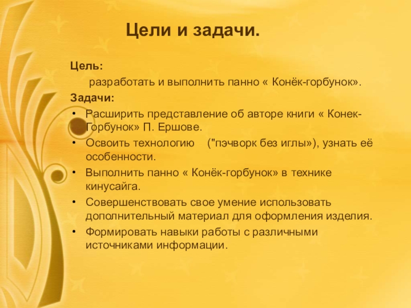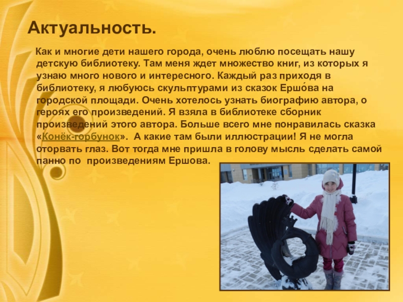 люблю посещать нашу детскую библиотеку. Там меня ждет множество книг, из которых я узнаю много нового и интересного. Каждый раз приходя в библиотеку, я любуюсь скульптурами из сказок Ершо́ва на городской площади. Очень хотелось узнать биографию автора, о героях его произведений. Я взяла в библиотеке сборник произведений этого автора. Больше всего мне понравилась сказка «Конёк-горбунок». А какие там были иллюстрации! Я не могла оторвать глаз. Вот тогда мне пришла в голову мысль сделать самой панно по произведениям Ершова.