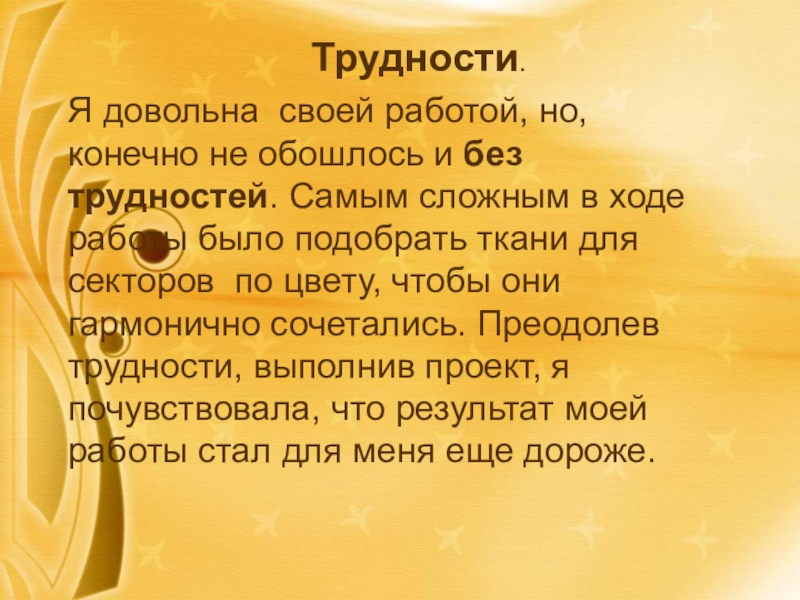 Самым сложным в ходе работы было подобрать ткани для секторов по цвету, чтобы они гармонично сочетались. Преодолев трудности, выполнив проект, я почувствовала, что результат моей работы стал для меня еще дороже.