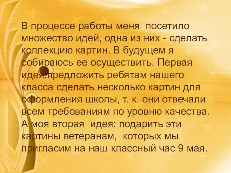 сделать коллекцию картин. В будущем я собираюсь ее осуществить. Первая идея:предложить ребятам нашего класса сделать несколько картин для оформления школы, т. к. они отвечали всем требованиям по уровню качества. А моя вторая идея: подарить эти картины ветеранам, которых мы пригласим на наш классный час 9 мая.