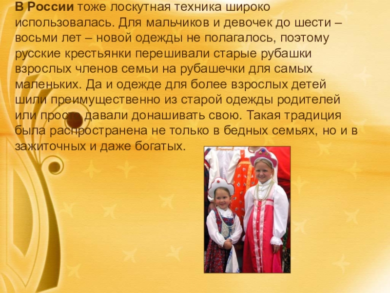 Слайд 6В России тоже лоскутная техника широко использовалась. Для мальчиков и девочек