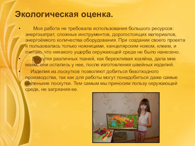 энергозатрат, сложных инструментов, дорогостоящих материалов, энергоёмкого количества оборудования. При создании своего проекта я пользовалась только ножницами, канцелярским ножом, клеем, и считаю, что никакого ущерба окружающей среде не было нанесено.