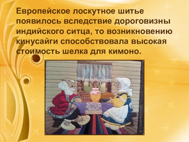 Слайд 7Европейское лоскутное шитье появилось вследствие дороговизны индийского ситца, то возникновению кинусайги
