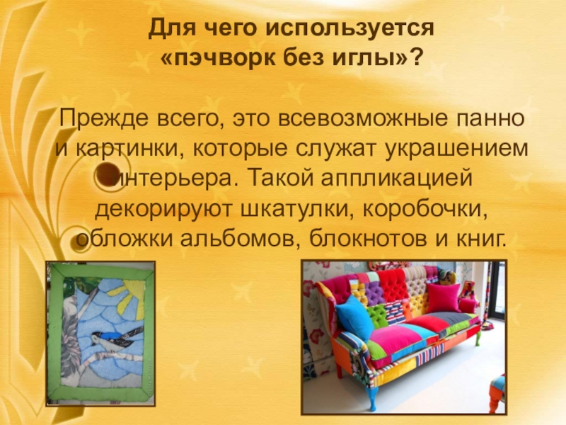 и картинки, которые служат украшением интерьера. Такой аппликацией декорируют шкатулки, коробочки, обложки альбомов, блокнотов и книг.
