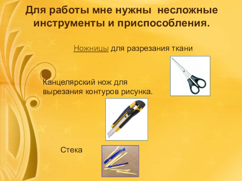 Слайд 14Для работы мне нужны несложные инструменты и приспособления.