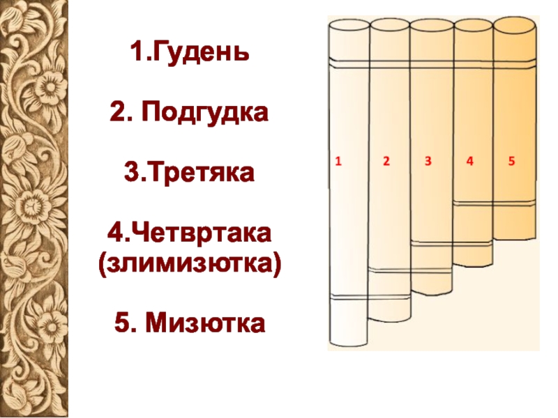 Слайд 71.Гудень 2. Подгудка 3.Третяка 4.Четвртака (злимизютка) 5. Мизютка