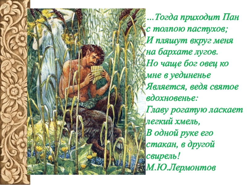 …Тогда приходит Пан с толпою пастухов; И пляшут вкруг меня на бархате лугов. Но чаще бог овец
