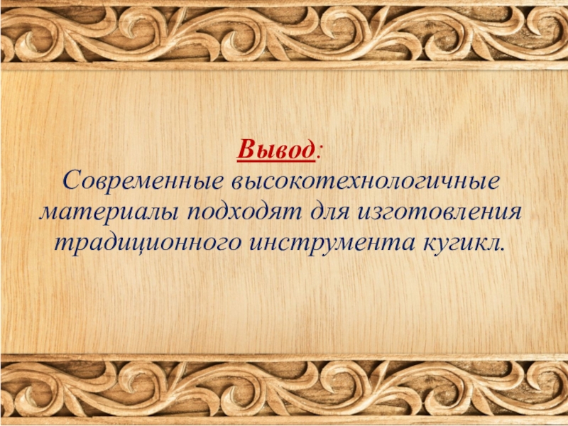 Слайд 19Вывод: Современные высокотехнологичные материалы подходят для изготовления традиционного инструмента кугикл.