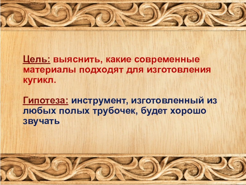Слайд 11 Цель: выяснить, какие современные материалы подходят для изготовления кугикл. Гипотеза: инструмент,